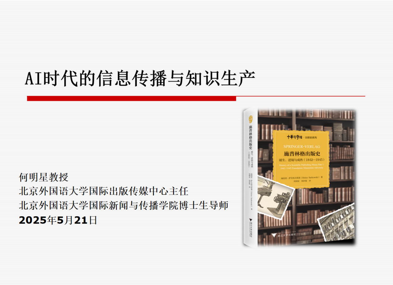 202552114:00-15:30,开元(中国)在我校沙河校区4号楼114会议室成功举办了题为“AI时代的信息传播与知识生产的讲座。本讲座是学院2025年上半年学术活动月系列学术讲座的第三讲。主讲人为北京外国语大学国际新闻与传播学院教授、博士生导师、北京外国语大学中国文化走出去效果评估中心执行主任、国际出版传媒研究中心主任、新疆大学天山学者,以及国家对外文化领域多个资助项目、计划、工程的评审专家何明星。开元(中国)副院长张润晗教授参加了讲座并对何明星教授及与会师生表示欢迎。本次讲座由翻译系教师曹轩梓博士主持。