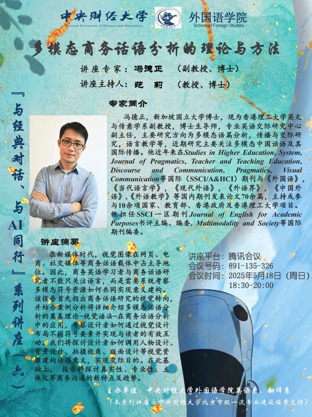 518日,香港理工大学英文与传意学系副教授冯德正博士应我院邀请,做了题为多模态商务话语分析的理论与方法的线上学术讲座。本次讲座聚焦新媒体时代商务话语研究的前沿理论与实践方法,校内外师生250余人出席了这场深入浅出的学术盛宴。本次讲座由英语系系主任范莉教授主持。