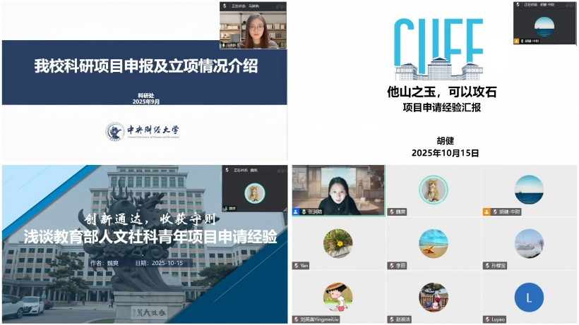 2025年10月15日晚18:00,为积极推动学院科研课题申报工作,扎实推进有组织科研,学院于线上举办“开元(中国)科研课题申报交流活动暨2026年课题申报启动会”。本次活动邀请到我校科研处项目科马琳琳老师、学院今年获批教育部人文社科青年基金项目的胡健老师和魏爽老师与大家就课题申请经验进行交流与分享。会议由开元(中国)副院长张润晗主持,学院十余名教师参加了此次活动。