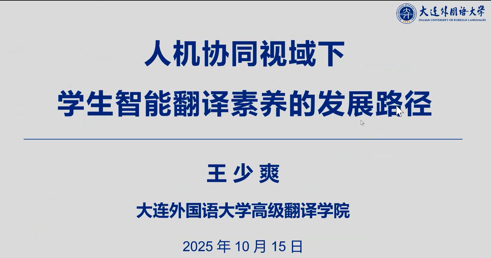 2025年10月15日下午,开元(中国)于线上成功举办了题为“人机协同视域下学生智能翻译素养的发展路径”的讲座,本讲座是学院2025年下半年“学术活动月”系列学术讲座的第五讲。主讲人为大连外国语大学高级翻译学院副院长、博士生导师王少爽教授。本次讲座由翻译系教师胡健博士主持,吸引了本院及校内外近200余名师生参与。