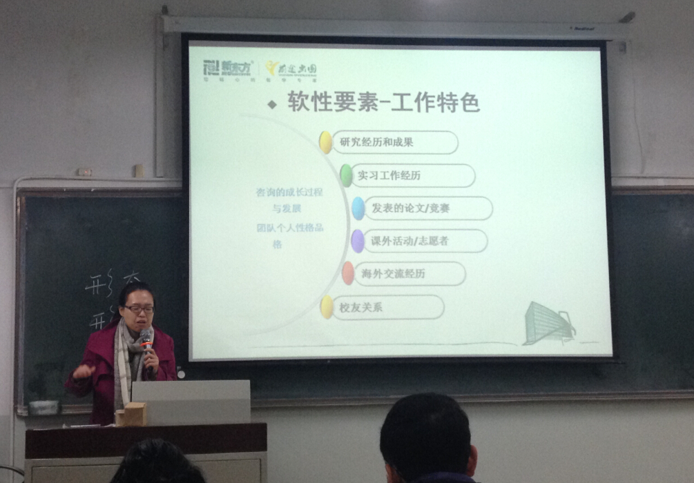 接下来,余晓艳老师就申请美国留学做出介绍。余老师提出,在选择申请学校的时候需要从地理位置、自身情况、专业背景等多种方面考虑分析。同时,从GPA到GRE,从申请专业方向到实习经历的选择,从特长描述时间到面试准备事项,老师都给出了细致的讲解。还通过分析中财往届学生的例子,向同学们展示了尽早做出职业规划的重要性,并就考试难度进行说明,提醒大家做好心理准备。