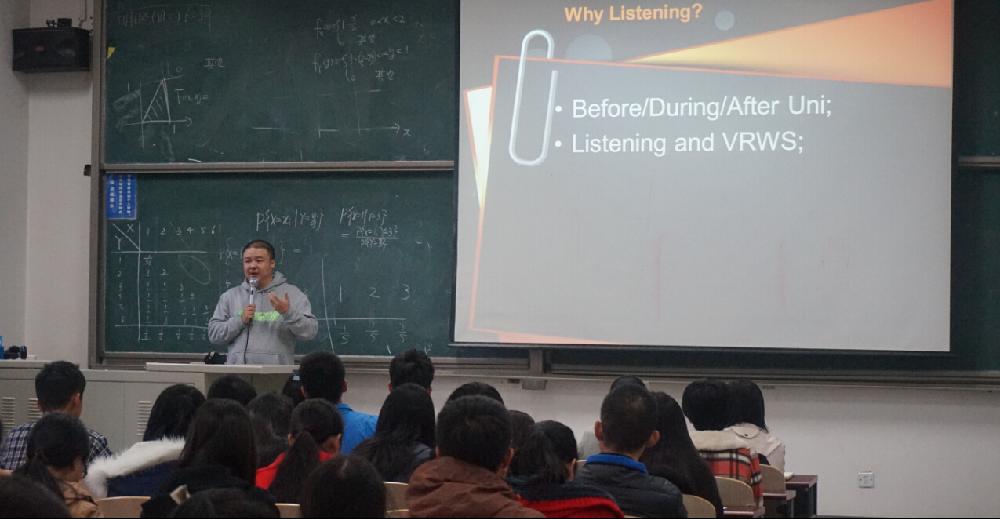 讲座正式开始之后,高晓宇老师先以英语听力的重要性开场,罗列了重要的考试类型,国内如大学英语四六级考试,专业英语四级八级考试;国外如托福,雅思,SAT,GRE等,听力无一例外都会是重点考查项目。高晓宇老师指出,英语水平在出国深造中起着决定性作用,如果因为英语实力有限而错过机会是令人遗憾的。而听力作为英语交际中的关键,更亟待提高。