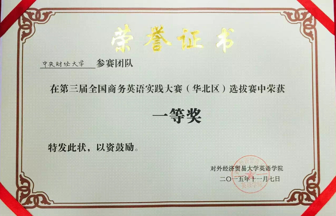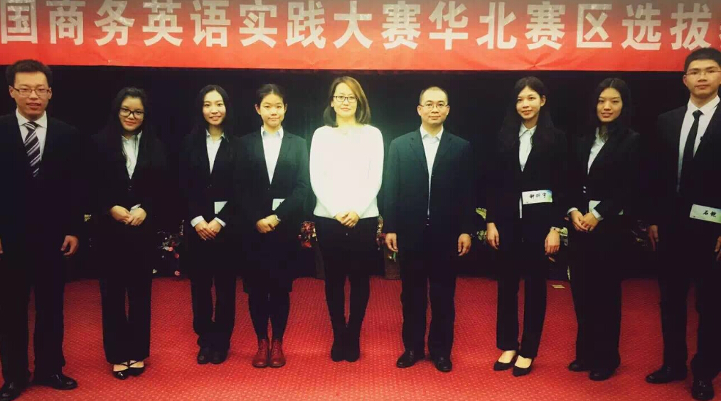 11月7号下午,第三届全国商务英语实践大赛(华北区)选拔赛在对外经济贸易大学如期举办。经过参赛队员们长达两三周的调研、讨论、练习,在我校李勤习、郭娟、张润晗、傅强、陈雨松、肖凤娟、闫书颖、孙瑾等八位老师的认真指导下,我校代表队最终以出色的表现脱颖而出,荣获华北赛区选拔赛一等奖(一等奖只有1个),凯旋而归。