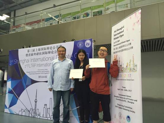 2017年4月14日至16日,第三届上海国际英语辩论公开赛暨首届“外研社杯”国际英语辩论公开赛在上海财经大学举办。作为上海财经大学百年校庆的系列活动之一,今年的公开赛在参赛规模,参赛队伍水平和评委质量等多个方面创下纪录。来自中国内地,港澳台地区以及英国,美国,马来西亚,新加坡,日本,韩国,俄罗斯等国家的辩论队伍参加了此项赛事。经过7轮循环赛,由我校开元(中国)高晓宇老师担任指导教师、2015级财经英语专业孙莹娃和金融实验班余浦弘组成的中央财经大学代表队在172支队伍中积分排名第四,进入淘汰赛环节,最终获得四分之一决赛队伍的佳绩。