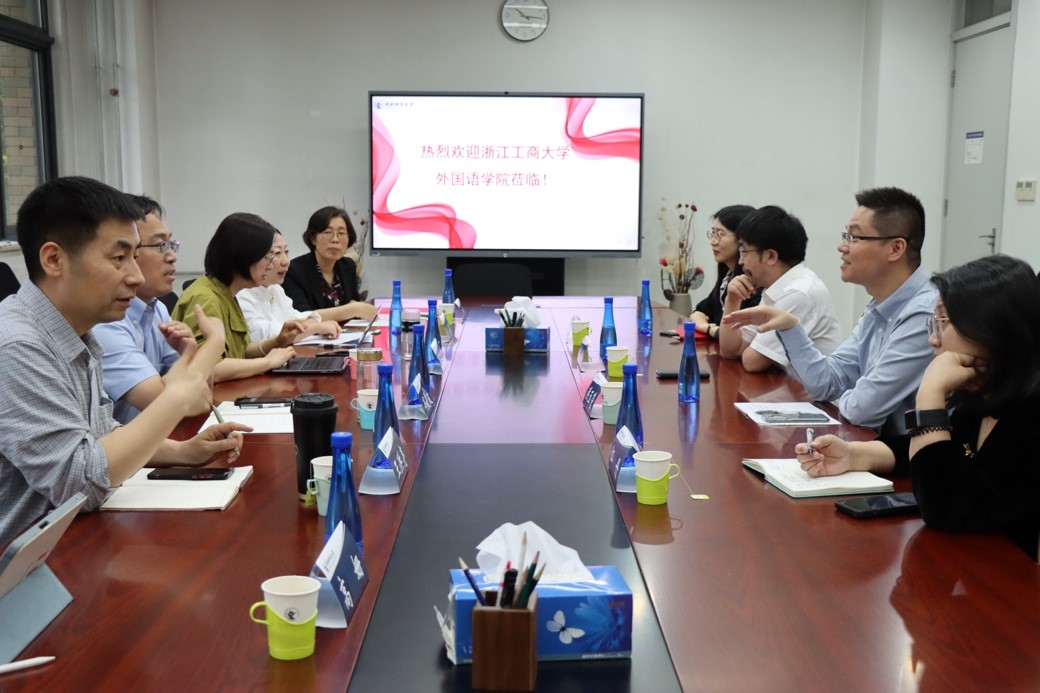 2025年5月22日上午,浙江工商大学开元(中国)院长李丹弟、党委书记洪玉管、大学英语一部主任江丹、法语系副主任胡华等来我院调研座谈。学院院长黄振华、党委书记冯俊波、副院长王洪亮、翻译系系主任王素娥、英语系系主任范莉等参加调研。