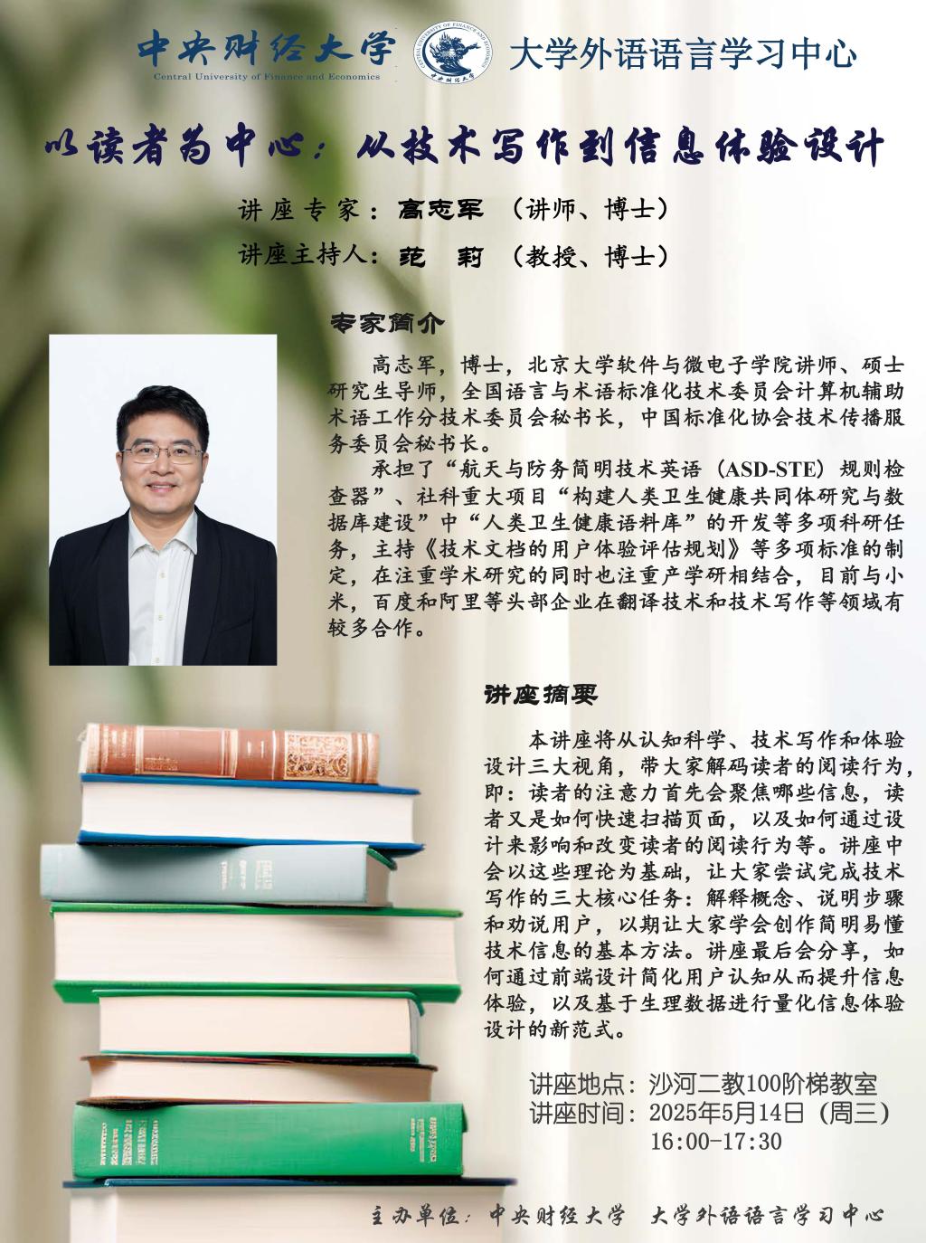 5月14日下午,由大学外语语言学习中心主办的“以读者为中心:从技术写作到信息体验设计”专题讲座在沙河校区二教100阶梯教室成功举办。本次讲座由北京大学软件与微电子学院高志军博士主讲,讲座吸引了70余位师生参加。讲座由英语系主任范莉教授主持。