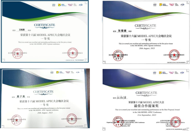 2025年9月19日至21日,由太平洋经济合作全国委员会、中国农业科学院海外农业研究中心、APEC Women Connect和国际技术转移协作网络指导,北京市环亚青年交流发展基金会、亚太青年模拟APEC大会组委会主办的第十六届MODEL APEC大会在北京顺利举办。我校3名学子张福健、黄子真、王铭恩代表学校参赛。