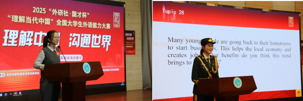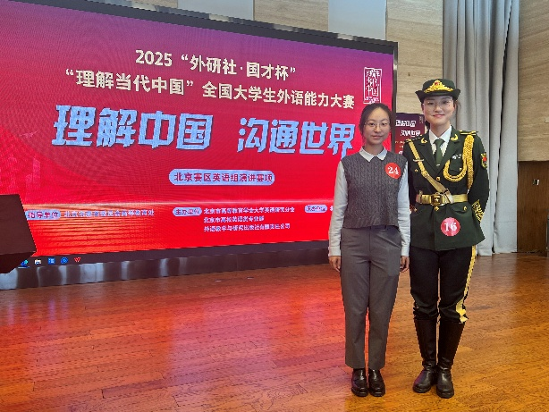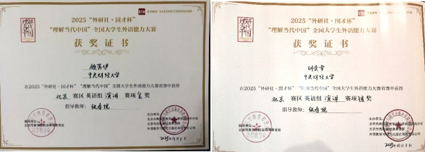11月1日,2025年“外研社·国才杯”“理解当代中国”全国大学生外语能力大赛北京赛区英语组演讲比赛落下帷幕。我校2025级顾芳伊、2024级胡奕雪两位同学凭借现场出色的综合表现,从北京赛区各大高校选派的48名参赛选手中脱颖而出,分别斩获赛区金奖与银奖,为学校赢得荣誉。